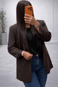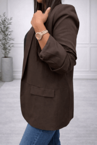 Adoptez un look chic et moderne avec ce blazer marron à coupe droite, une pièce incontournable pour un dressing élégant.