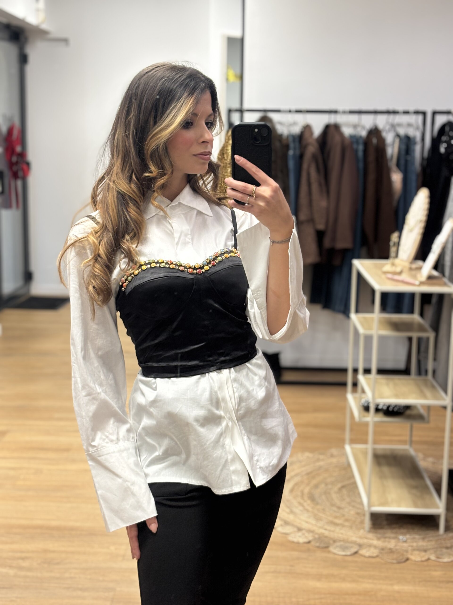 Sa coupe ajustée style bustier met en valeur la silhouette tandis que la bordure décorée de strass et de perles colorées apporte une touche chic et originale.