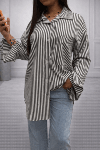 Adoptez un look casual chic et tendance avec cette chemise oversize à rayures noir et blanc, une pièce intemporelle qui allie confort et élégance.