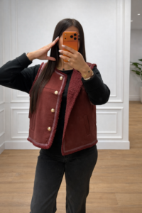 Apportez une touche chic et chaleureuse à votre tenue avec ce gilet sans manches en suédine bordeaux.