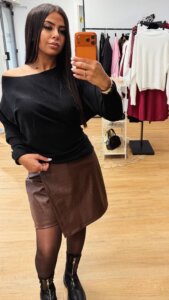 Facile à associer, elle se porte parfaitement avec un pull, un top ou une chemise pour créer un look casual chic ou plus habillé.