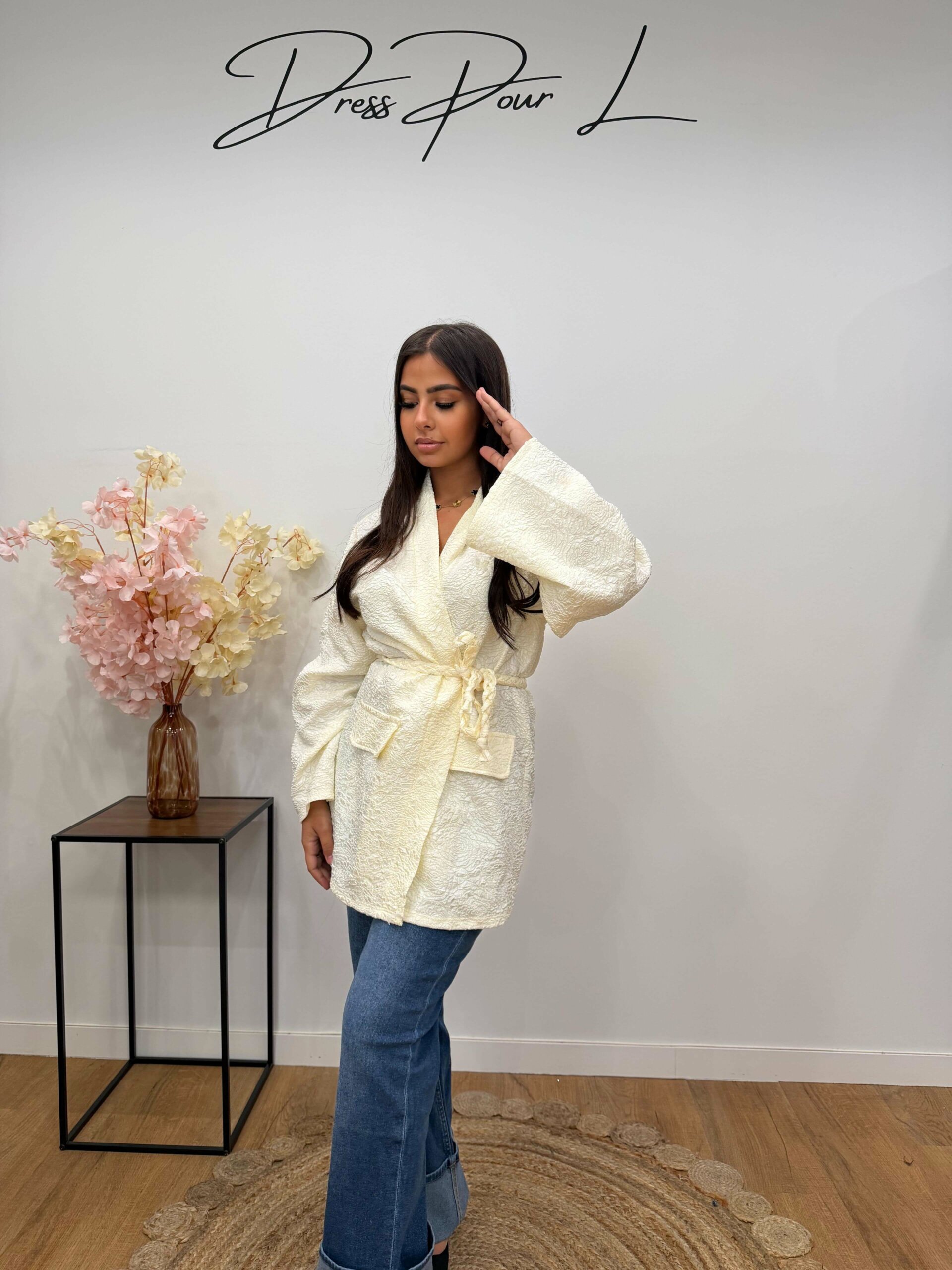 Apportez une touche de douceur et d’élégance à votre tenue avec ce kimono jaune très clair texturé.