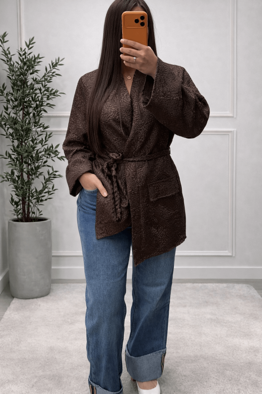 Apportez une touche d’élégance et d’originalité à votre tenue avec ce kimono marron texturé, une pièce chic et raffinée parfaite pour sublimer vos looks.