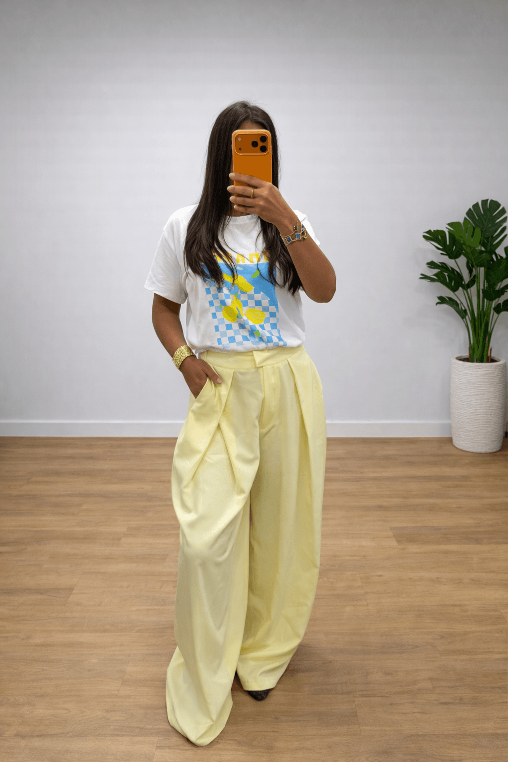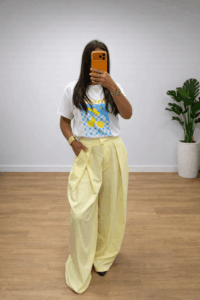 Facile à associer, ce pantalon se porte aussi bien avec un t-shirt casual, une chemise élégante ou un top ajusté. Sa teinte jaune pastel lumineuse apporte une touche douce et tendance à la tenue.