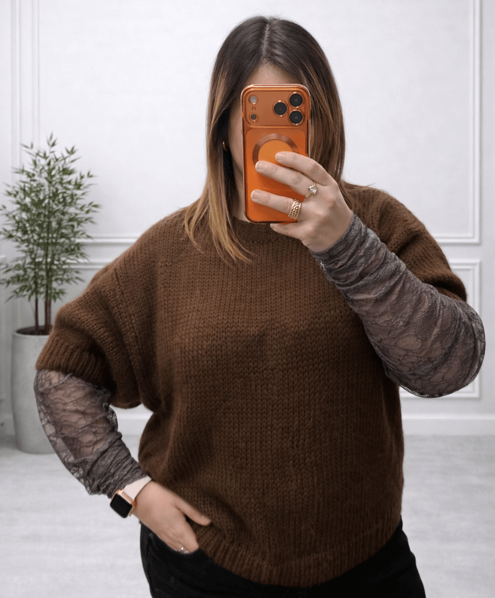 Apportez une touche de chaleur et d’élégance à votre tenue avec ce pull marron à manches dentelle, une pièce à la fois confortable et féminine.