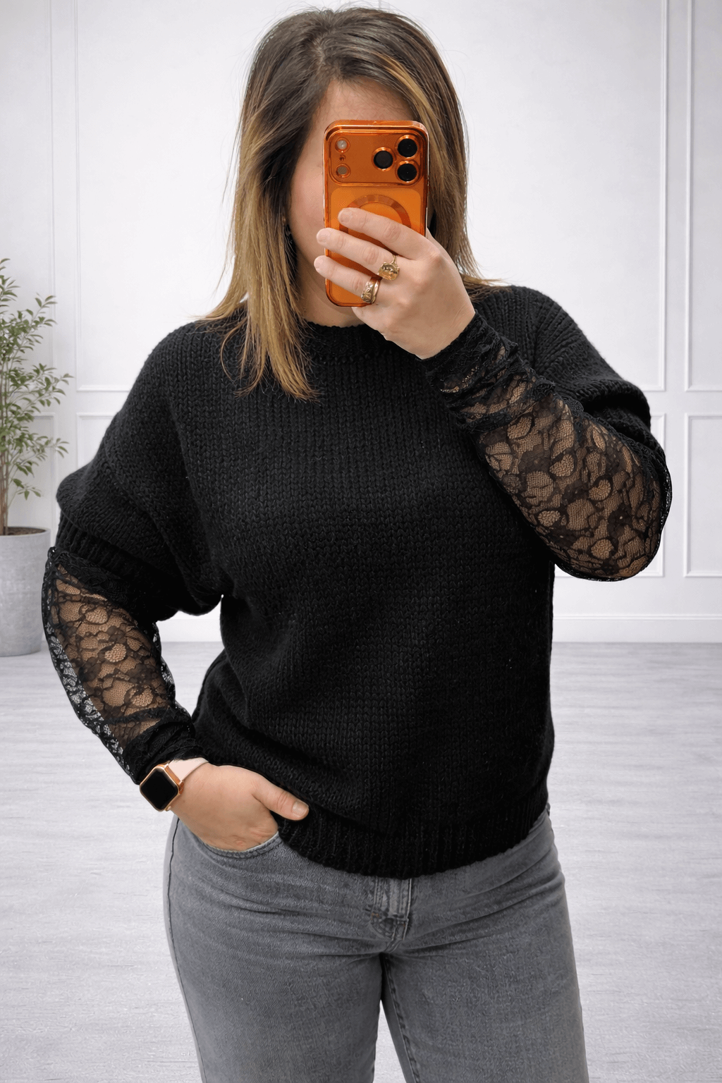 Apportez une touche de chic et d’élégance à votre dressing avec ce pull noir à manches dentelle.