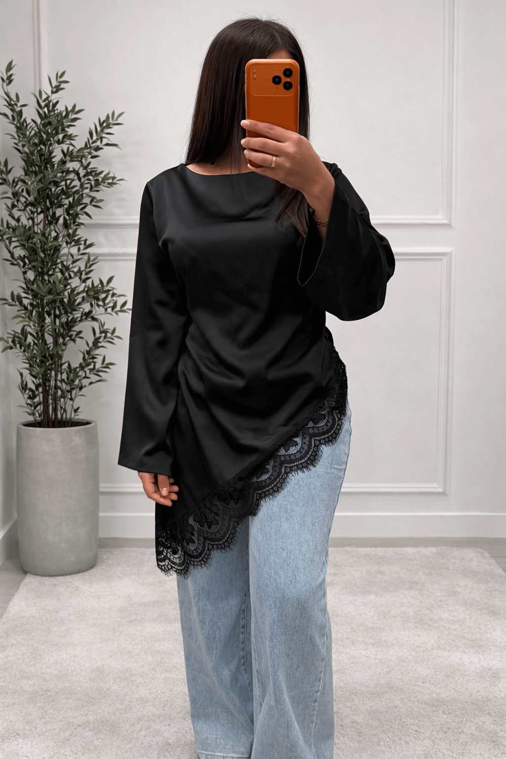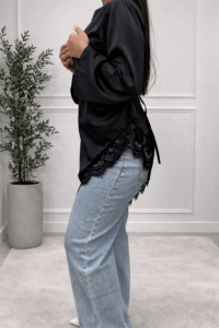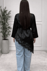 Sa coupe fluide et asymétrique est sublimée par une magnifique finition en dentelle délicate, qui ajoute une note féminine et sophistiquée. Les manches larges apportent confort et élégance tout en donnant une allure moderne.