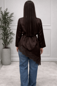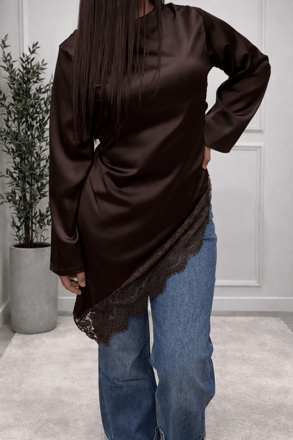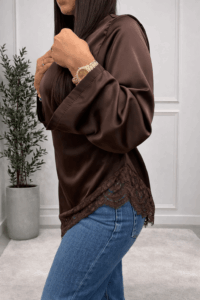 Succombez au charme de cette tunique satinée marron, une pièce élégante et intemporelle qui apporte une touche sophistiquée à votre tenue.